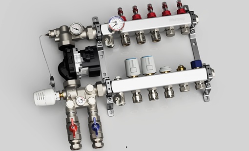 En præcisionskonstrueret fordeler, der effektivt styrer og balancerer vandflowet i flere gulvvarmekredse for optimal systemydelse.